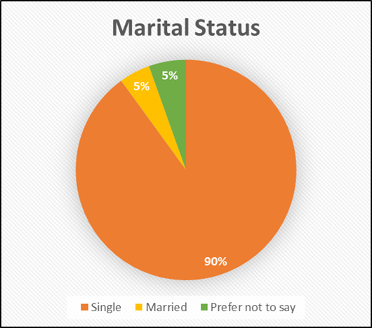 In terms of marital status, most of the participants were single, making up 90% of the sample. Only 5% were married, while another 5% preferred not to disclose their marital status. This shows that the sample was largely composed of unmarried individuals, which may have influenced patterns of emotional expression and willingness to seek help.