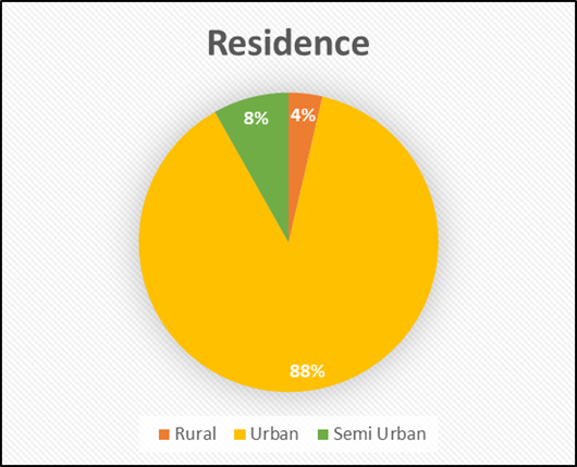 A large majority of the participants (88%) belonged to metropolitan areas, indicating that the sample was largely urban in nature. In comparison, only 8% of the participants came from semi-urban backgrounds, while just 4% were from rural areas. This distribution suggests that the findings of the study are more reflective of urban populations and may not fully capture the experiences of individuals from rural or less developed regions.