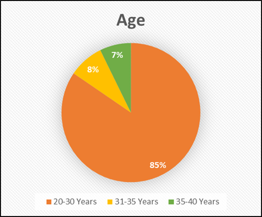 The age distribution of the participants indicates that a large majority belonged to the 20–30 years age group (85%). In comparison, a much smaller proportion fell within the 31–35 years group (8%) and the 35–40 years group (7%). This shows that the sample was mainly made up of younger adults, with relatively limited representation from individuals in the higher age brackets within the selected range.